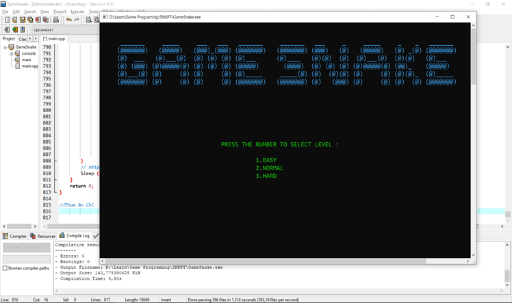 }Các bạn có thể cải tiến thêm đoạn code trên các chức năng khác như: thêm các vật phẩm, chướng ngại vật, các cách xử lí khác,… tùy sở thích mà các bạn có thể làm rất nhiều thứ thú vị (mình thì thêm các chướng ngại vật di chuyển, thêm chức năng chọn độ khó, các chức năng pause, exit, hiển thị thức ăn lớn nếu ăn 5 thức ăn nhỏ,…).