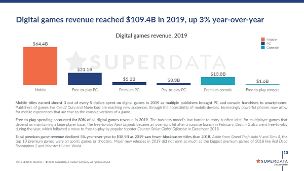 Theo số liệu thống kê từ SuperData, doanh thu game F2P (Mobile+PC+Console) chiếm 80% doanh số trong 2019, và tăng trưởng 6% so với 2018. Trong khi doanh thu game premium giảm 5% so với trước đó.