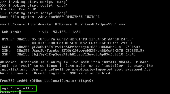 Sau đó ấn Enter và đăng nhập với username “installer“, mật khẩu “opnsense“.