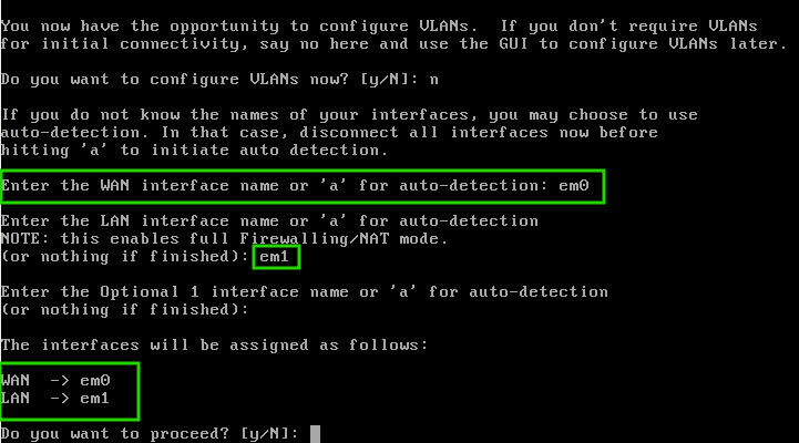 Với thiết lập này, chọn không cấu hình VLAN và đặt giao diện WAN là em0, giao diện LAN là em1.