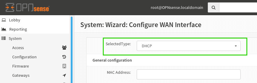 Tiếp theo là thiết lập giao diện WAN. Chỉ cần chọn là DHCP, OpnSense sẽ cố gắng thu thập cấu hình WAN của nó từ ISP.