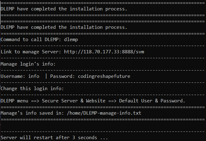Khi hoàn thành server sẽ tự động reboot. Bạn có thể sử dụng thông tin sau để quản trị