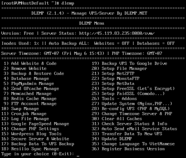 Sau đó bạn có thể chọn 0 để quay về menu chính. Hoặc mở giao diện dlemp bằng lệnh dlemp.