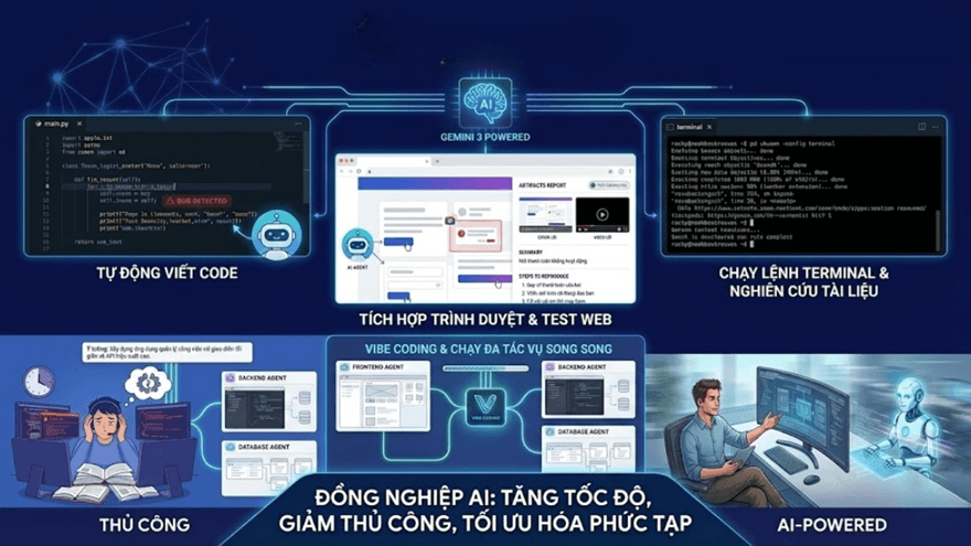 Antigravity tích hợp trình duyệt để AI tự kiểm thử giao diện người dùng. Hệ thống có thể chụp ảnh, quay video lỗi và tổng hợp báo cáo chi tiết, đồng thời giúp phát hiện sớm các vấn đề mà trước đây cần kiểm thử thủ công.