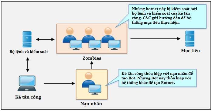 Botnet dùng để thực hiện một nhiệm vụ liên tục. Những botnet ác ý truy cập đến hệ thống bằng script và mã độc, nó thông báo cho kẻ tấn công khi hệ thống bị botnet kiểm soát. Thông qua botnet, kẻ tấn công có thể kiểm soát hệ thống và gửi yêu cầu để thực hiện tấn công DoS.