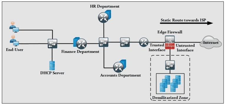 Trên là một kịch bản điển hình của SOHO và môi trường doanh nghiệp quy mô vừa, nơi toàn bộ cơ sở hạ tầng mạng được hỗ trợ bởi một vài bộ định tuyến và chuyển mạch. Nếu tường lửa biên được coi là tâm triển khai bảo mật, thì bất kỳ cấu hình sai nào đều có thể dẫn đến các cuộc tấn công quy mô lớn. Nói chung, một lớp tiếp cận bảo mật được tuân theo và gói tin đi qua nhiều lần kiểm tra bảo mật trước khi đến đích.