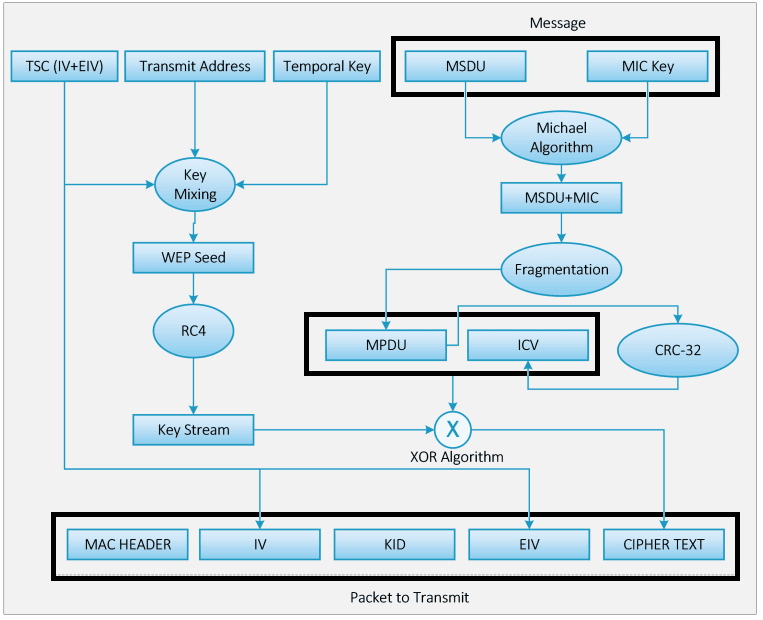 - Đơn vị dữ liệu dịch vụ MAC (MSDU) và Kiểm tra tính toàn vẹn của thông báo (MIC) được kết hợp bằng cách sử dụng Thuật toán Michael.