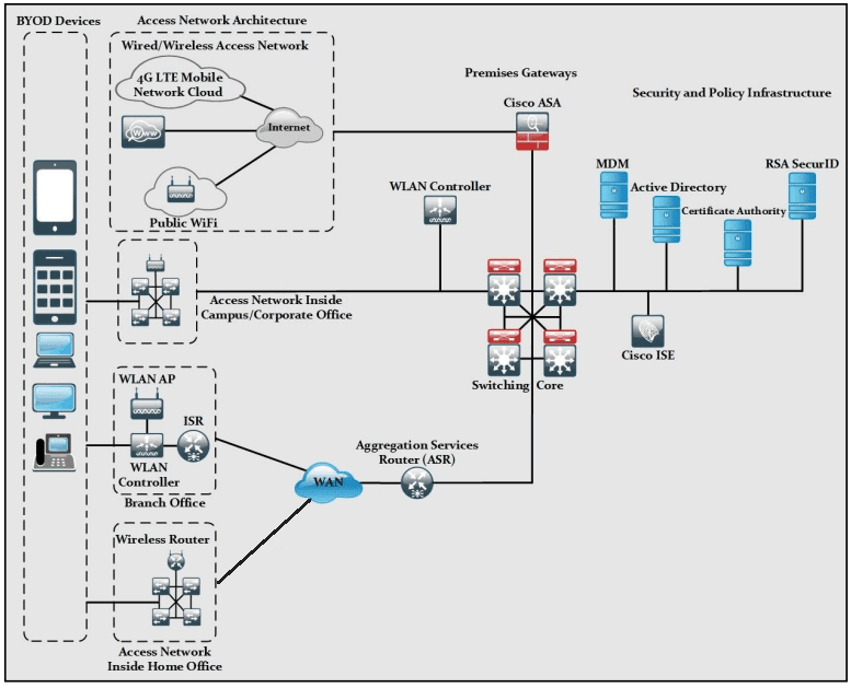Mô hình Cisco BYOD dựa trên Cisco Borderless Network Architecture và nó cố gắng thực hiện các phương pháp chung tốt nhất (BCP) trong việc thiết kế mạng văn phòng chi nhánh, văn phòng tại nhà và khu vực khuôn viên trường.