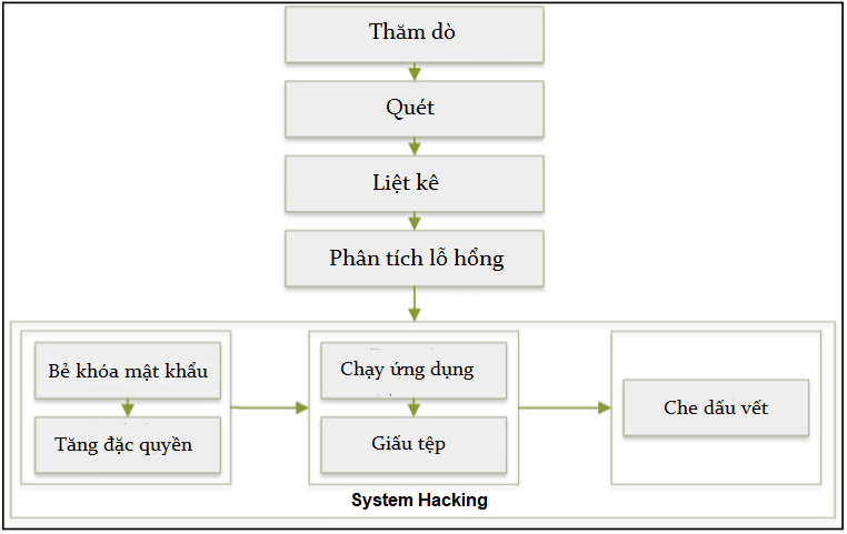Với thông tin thu thập được từ các công đoạn xâm nhập trước như thăm dò, quét, liệt kê, bây giờ bạn có thể chuyển qua level tiếp theo: System Hacking. Sử dụng tất cả những thông tin đã thu thập, chúng ta sẽ đi tiếp đến bước xâm nhập hệ thống.