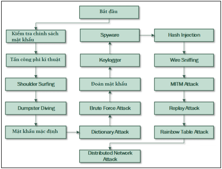 Tấn công chủ động bao gồm nhiều kĩ thuật tiếp cận trực tiếp với mục tiêu để bẻ khóa mật khẩu bao gồm: