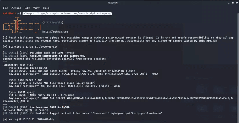 python sqlmap.py –u "http://testphp.vulnweb.com/search.php?test=query"