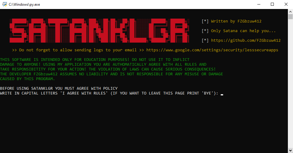 SATANKLGR là 1 tool được viết bằng python bởi FZGbzuw412 để tạo keylogger gửi vể mail của bạn. Nó được tạo và thiết kế dành riêng cho Window. SATANKLGR không chỉ là một tool keylogger bình thường mà nó còn có thể ghi lại keystroke, screenshot và webcam.